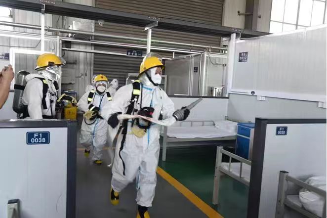 上午10點(diǎn)整,消防演練正式開始,在接到消防中控室的指令后,方艙醫(yī)院1號艙29床發(fā)生火情,全體隊員迅速穿戴整齊消防服和防護(hù)服在預(yù)定時間內(nèi)到達(dá)了演練火災(zāi)現(xiàn)場,執(zhí)行了打開消防栓箱門拉水帶、擰瞄子、開閥門、緊急疏散病人進(jìn)行警戒撲救滅火等演練科目。消防演練結(jié)束后,全體隊員迅速進(jìn)入反恐應(yīng)急演練狀態(tài),根據(jù)演練科目內(nèi)容,其中一名隊員扮演患者情緒失控人員,手持兇器與醫(yī)護(hù)人員發(fā)生爭斗,反恐隊員收到指令后在最短時間內(nèi)攜帶防暴裝備進(jìn)入現(xiàn)場,到達(dá)現(xiàn)場與鬧事人溝通無效后,反恐隊員迅速采取措施將其制服,圓滿完成科目內(nèi)容。
